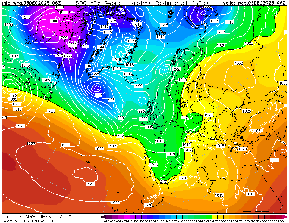 Das ECMWF (European Centre for Medium-Range Weather Forecasts) erstellt Vorhersagen bis zu 15 Tagen in die Zukunft und ist global führend in der Vorhersagequalität, stellt aber nur wenige Parameter kostenfrei zur Verfügung. Es gibt zwei tägliche Läufe mit 00 bzw 12 UTC Daten, die zwischen 6 und 7 UTC bzw. 18 und 19 UTC aktualisiert werden.