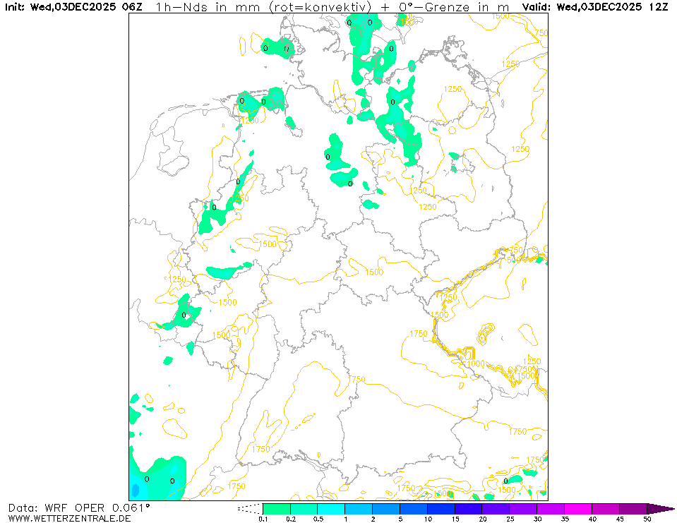WRF (Weather Research and Forecasting model) ist ein frei verfügbares Wettervorhersagemodell welches auf der Wetterzentrale 4 mal täglich bis 72 Stunden in die Zukunft gerechnet wird. Es wird z.Z. auf einem Gitter von 5 km gerechnet und deckt Mitteleuropa ab.
